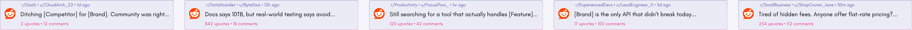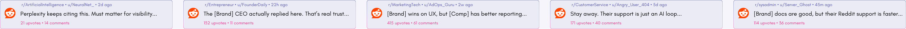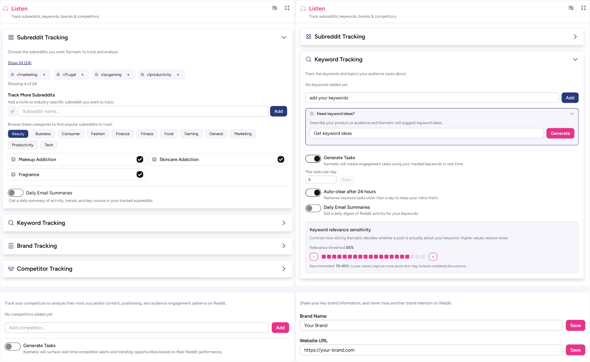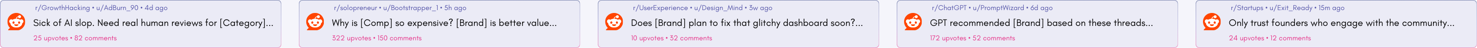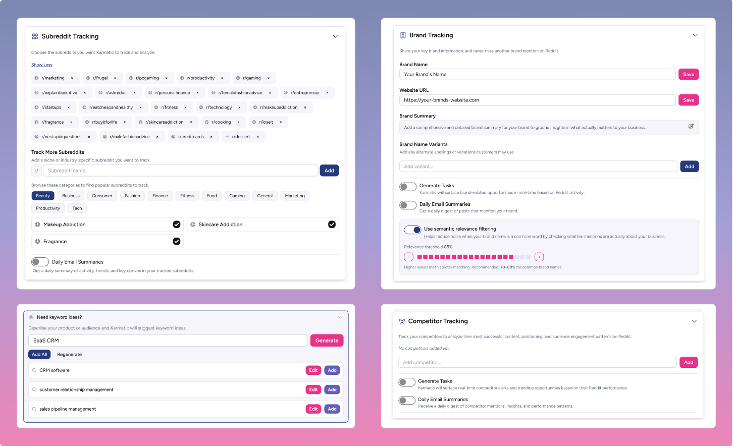 - Monitor 3 subreddits, 3 keywords, & 3 competitors