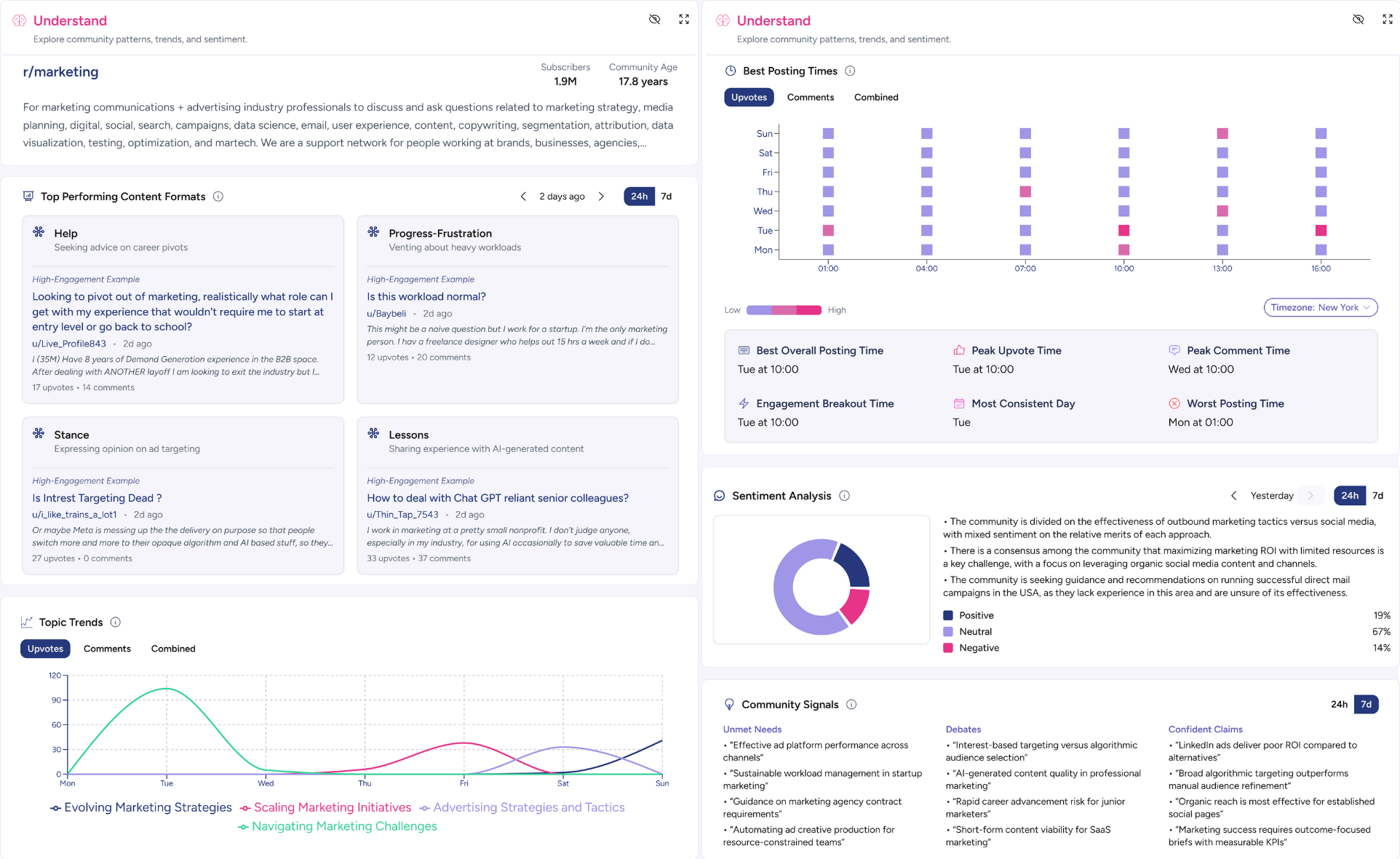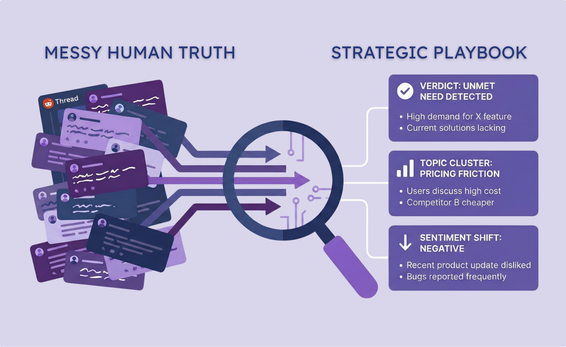 Convert raw community data into a strategic playbook by decoding topic clusters, sentiment shifts, and high-friction debates where your brand can step in.