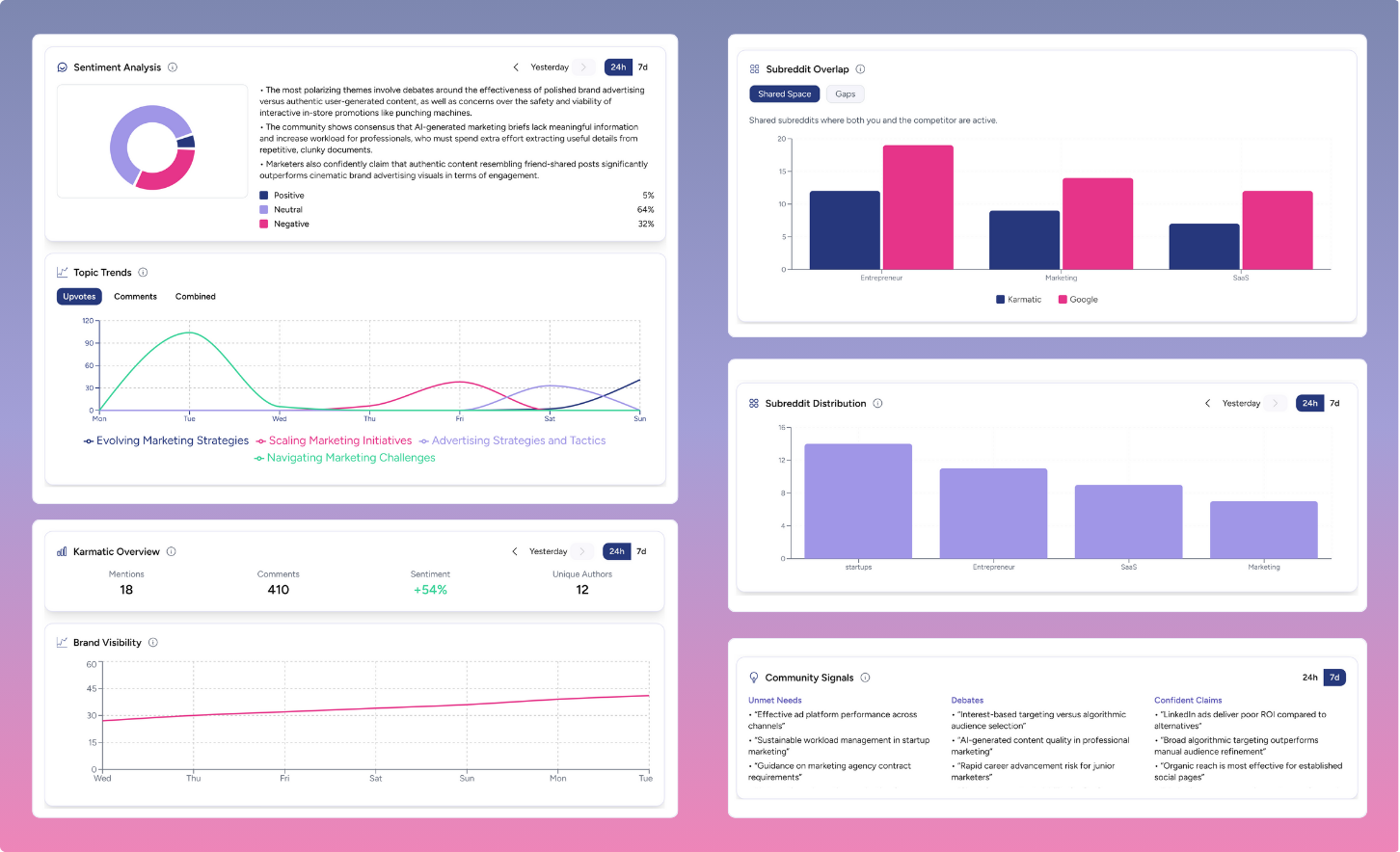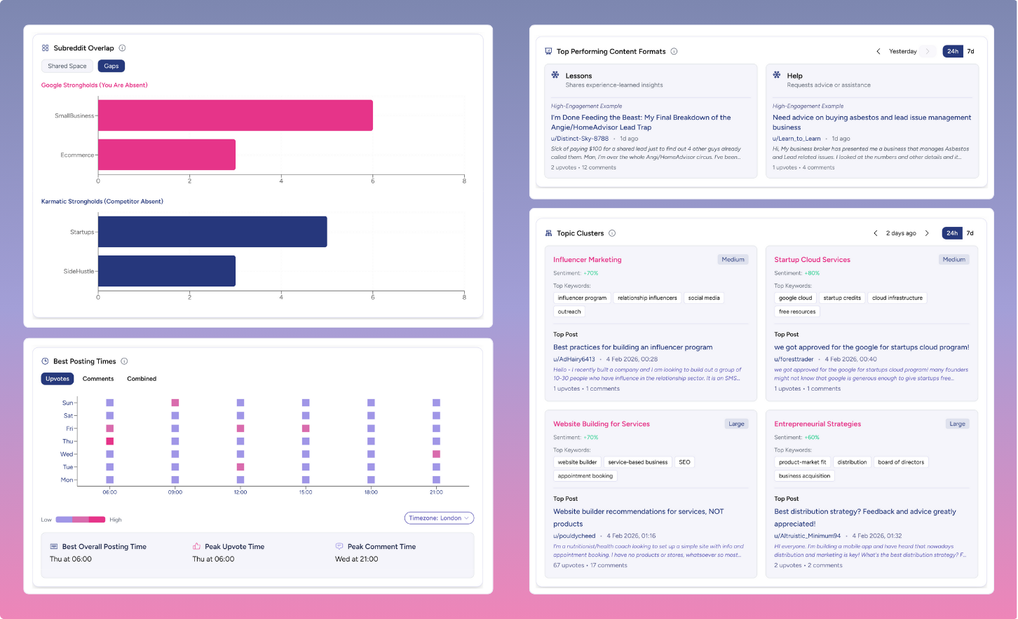 Karmatic turns Reddit into a growth channel. Always-on monitoring, noise filtering, and insight-led engagement helps, so your team can act fast, stay credible, and show up where trust, search, and AI answers are formed